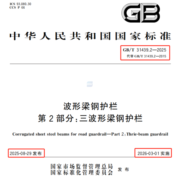 GB/T 31439.2-2025《波形梁鋼護欄 第2部分:三波形梁鋼護欄》?于2025年8月29日發布,計劃于2026年3月1日實施,替代2015版標準,規范公路交通工程中三波形梁鋼護欄的技術要求與安全性能。如需要2025標準電子版,可點擊關注,評論區留言需要2025標準電子版。??