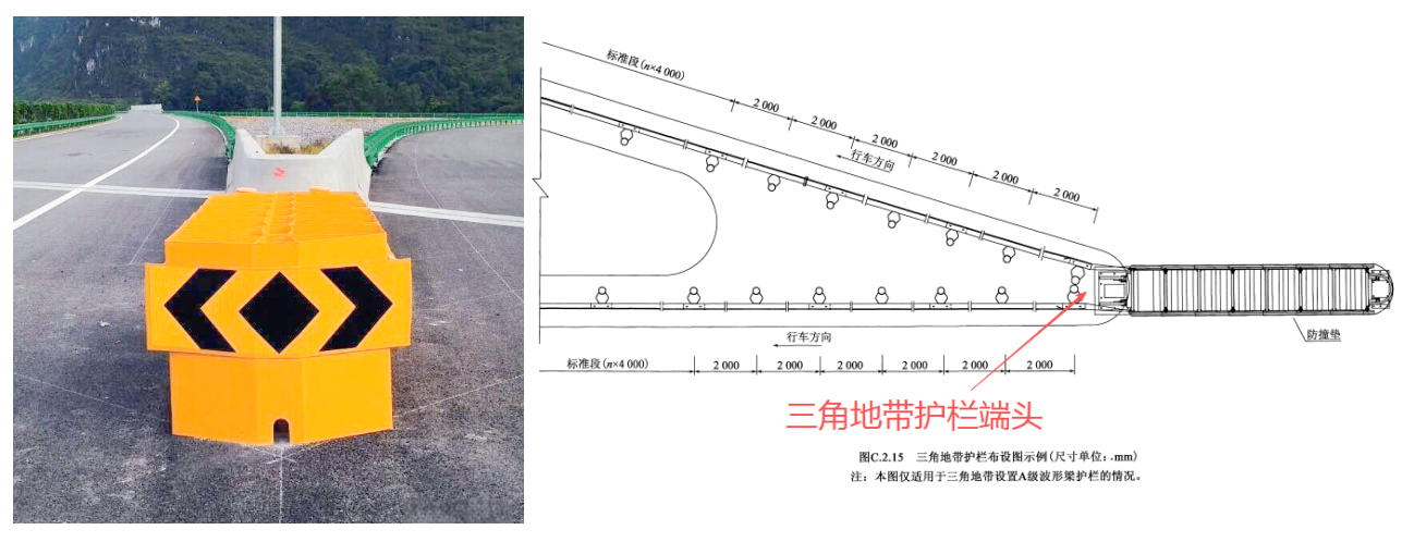 交通分流處三角地帶波形梁護欄的端頭處理,應符合下列規定: